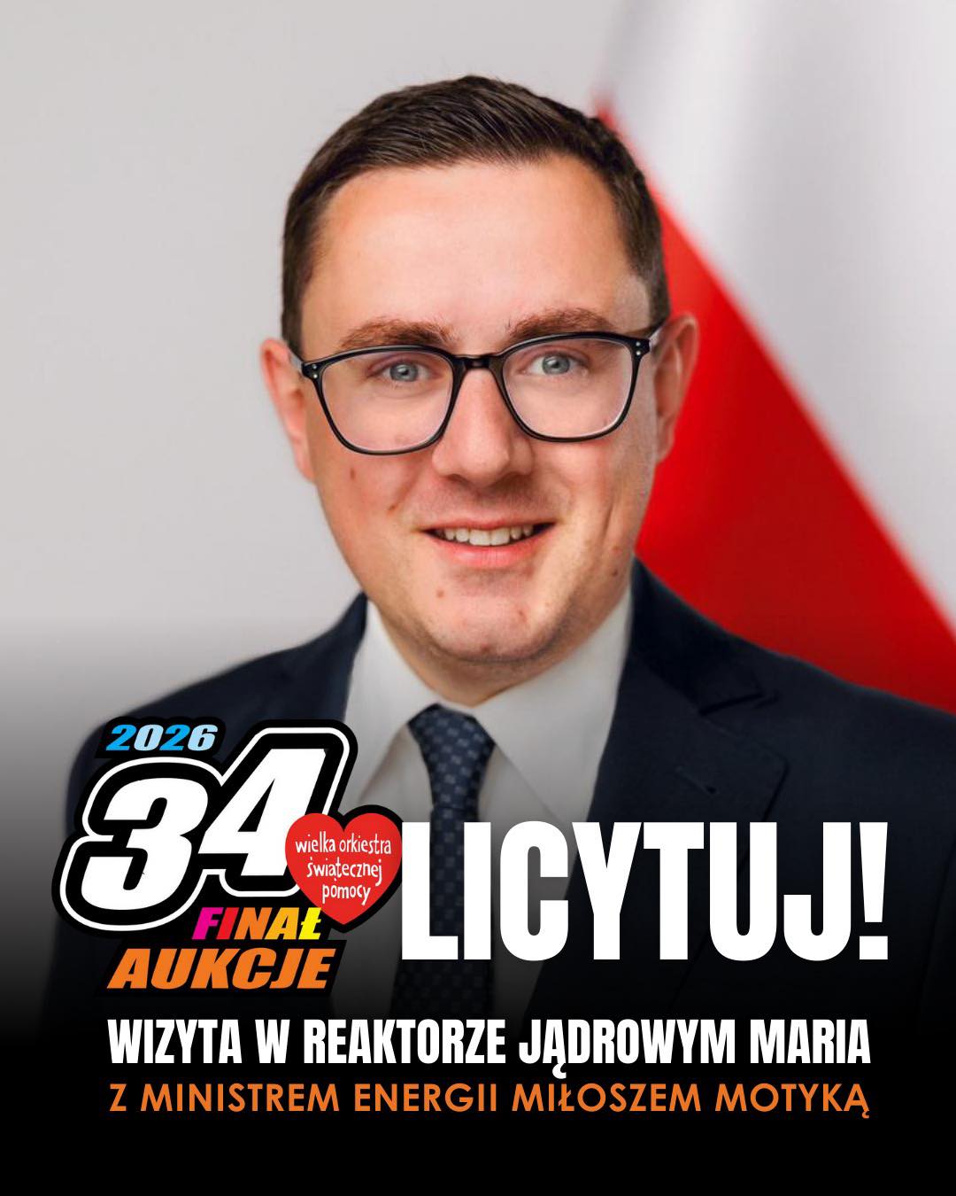 Przedmiotem tej licytacji jest indywidualna wizyta w towarzystwie Ministra Energii Miłosza Motyki i Dyrektora Narodowego Centrum Badań Jądrowych w jedynym, pracującym w Polsce reaktorze badawczym MARIA. Reaktor jest zlokalizowany na terenie Narodowego Centrum Badań Jądrowym w Otwocku. To jedyna tego typu okazja, by poznać jeden z najbardziej zaawansowanych technologicznie obiektów badawczych w kraju oraz poznać jego znaczenie dla rozwoju nauki i ochrony zdrowia w Polsce. Zwycięzca będzie miał możliwość zaproszenia 3 osób towarzyszących. Jest to wycieczka dla uczestników powyżej 13 roku życia. Termin zwiedzania: do 30 czerwca 2026, należy go ustalić 2 tygodnie wcześniej. Dojazd we własnym zakresie.
